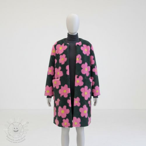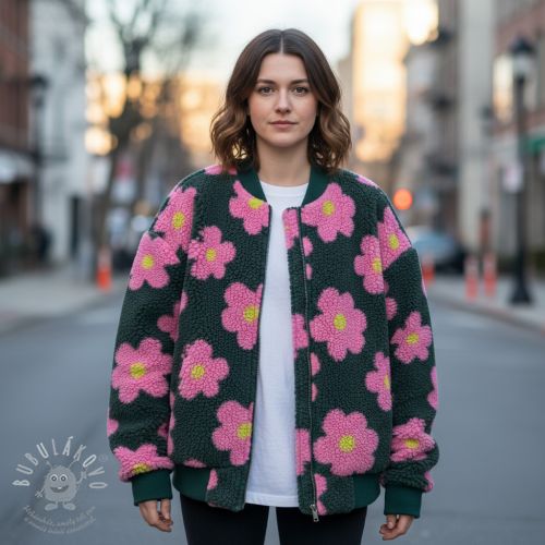 Kabát anyag TEDDY JACQUARD Flowers army green/pink